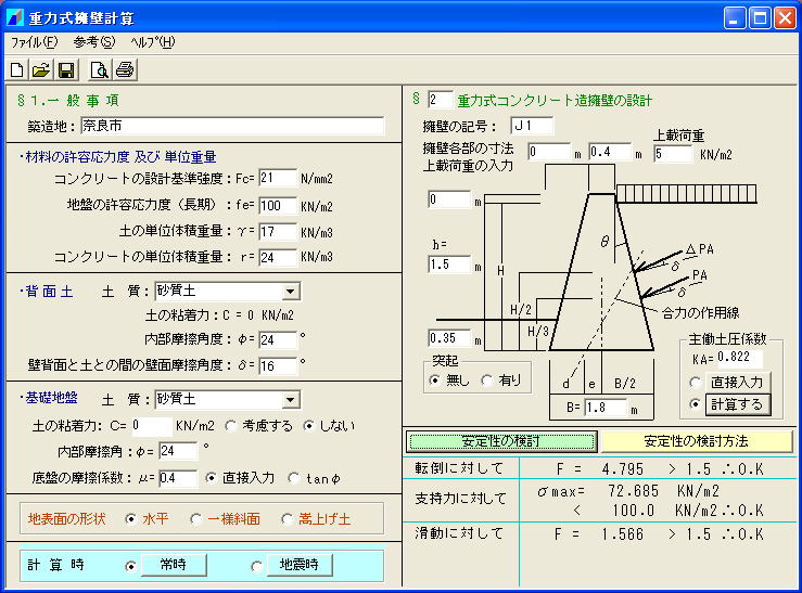 | ○ | 技術基準、諸係数、安定性の検討方法等は各地域の基準等によりますが、地域を指定して下されば、その地域の技術基準、諸係数、安定性の検討方法等を本ソフトに追加することができますので、ご相談に応じます。 |