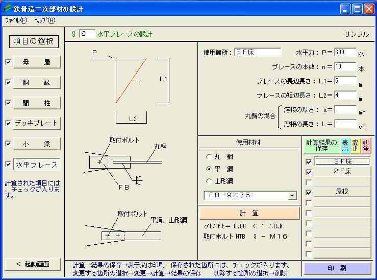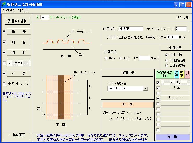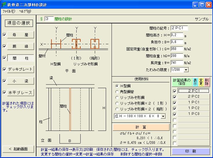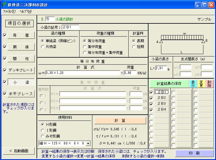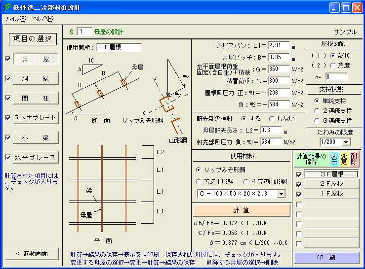 | ○ | 本ソフトは、鉄骨造建築物の二次部材(折版、母屋、胴縁、間柱、耐風梁、デッキプレート、水平ブレース、小梁、階段ささら桁)を計算するものです。 |