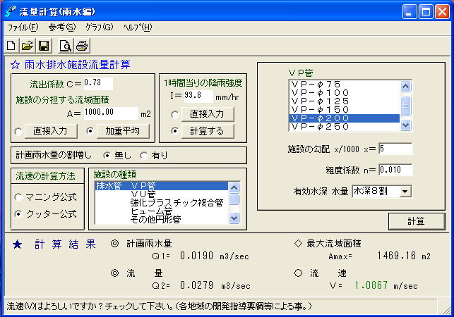 雨水排水施設(VP管、VU管、強化プラスチック複合管、ヒューム管、U型トラフ等)の、勾配による流速及び流量を計算し、計画雨水量と比較して施設の種類及び大きさを決定します。 |