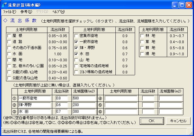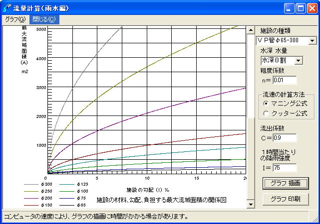 施設の材料、勾配、負担する最大流域面積の関係を表すグラフが描画できますので、3つの関係がよくわかり、事前におおよその目安をつけることができます。 |