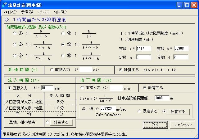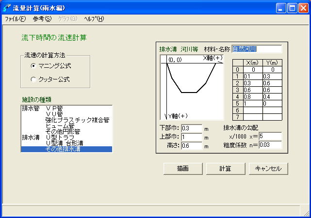 計画雨水量の計算は合理式、流速の計算はマニング公式又は、クッター公式によります。 |