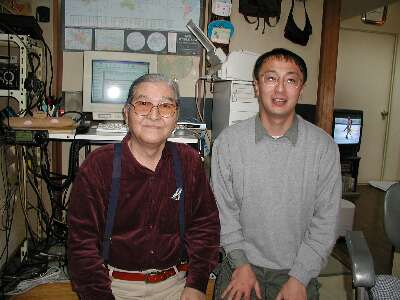 | 2002年 2月19日 JA3AGZ東大阪市にお住まいのJA3AGZ 樗木(オオテキ)さんにお会いしました。あちこちの電子掲示板にお出ましで、「爺」など多数のハンドルで書き込みを楽しまれております。樗木さんのシャックを訪ねたときの1枚です。左が樗木さんで、右が私です。 この日はじめてお逢いしたのですが、あちこちでの書き込みを拝読しているので、はじめてお逢いしたような気がせず、昔からおつきあいがあった様な気がしました。「遠くから良く来てくれました」と、押しかけたにもかかわらず、ずいぶん喜んでいただき、素晴らしいもてなしをしていただきました。 樗木さんは、掲示板で「私はぼけている」と頻繁に書き込んでいるので、どんな方だろうかと正直なところ心配していました。しかしお話は面白いし、ギャグも解っていただける、頭の柔らかい楽しい方でした。シャックで話し込んでいると、あっという間に時間が経っていて、ずいぶん遅い時刻までお邪魔してしまいました。機会があったら、是非ともまた遊びに伺いたいです。 |