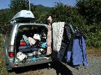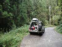 目覚めて天気ならこんな感じ 愛車ぶらきちの中には、レインコートがわりのジャンパーや、雨傘、いつでも車中泊できるようにシュラフなどが積まれています。というより、降ろすのが面倒で車に入れっぱなしにしています。 街中ではさすがに格好悪くて出来ません。朝の山奧、ささやかな楽しみです。 |