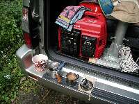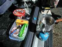 さて 朝飯にするか 運用後の朝御飯の様子です。愛車後部が調理場になります。この日のメインディッシュは1.5倍が売り文句のカップラーメン。2Lの水タンクを2つ常備し、20年使っているキャンピングコンロで湯を沸かします。 アウトドアショップだと、鍋だけの値段ですべて揃う値段がついています。100円ショップ、恐るべし(笑) |