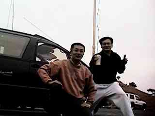 巨大風車に感動の青山高原国道163号線で上野方向に走り、青山高原への道標に従って進むと、高原を縦貫する県道に難なく入ることが出来ました。 尾根伝いに入ると、白く大きな風車があちこちに建っていました。 大きな風車に目をとられてしまってふらりふらりの走行も、冬場の走行車の少なさのおかげで危険ではありませんでした。 目的地の名賀郡青山町は、縦貫道沿線市町村も最南町です。 青山町に入ってすぐの「ふるさと公園第2駐車場」は、我々以外に車が駐車しておらず、安心して設営作業が出来ました。 景色いまいちの道路際スペースに遠慮がちに陣取りました。 1月の山の上とは思えない陽気で、考えていた程過酷な作業ではありませんでした。 FBFB! 右側でビールを握ってポーズしているのがドラ、左側の柿色トレーナーが私です。 |