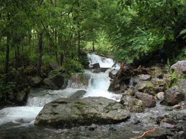 雑木の林、シラビソ、ブナの林、カラマツ林と過ぎ、途中の水場は風もよく通る気持ち良いブナ林で、冷たい水で顔を洗ってホッと一息です。塩川に沿っての明るい林は渓流はもちろん、紅葉も素晴らしいことでしょう、かの奥入瀬渓谷に負けず劣らずと思えるほどの美しい渓谷です。