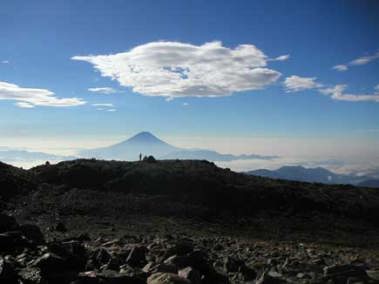 こちらに富士山、こちらに甲斐駒とイメージして待ちますが、なかなか晴れそうになくしぶしぶ山頂を後にします。