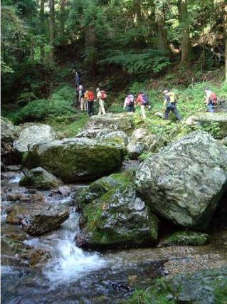 水辺を離れて植林に入り、風が通らず暑い。稜線に出るまで殆ど急登が続く。
