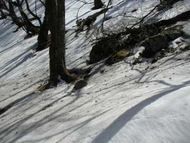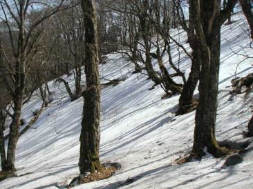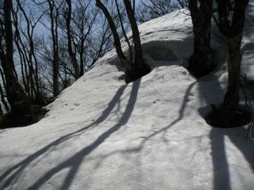薊岳から明神平までは自然林とこの時期に見られる残雪が最も美しいと私は思っています。木洩れ陽さす輝く雪面に木立が影を落とし、明と暗がくっきりと描かれる、冬から春にバトンを送るこの時期のこの雪に会いたかったのです。