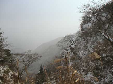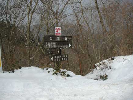 比良駅を降りると湖を渡る風はさすがに冷たいです。ロープウェイの廃止と共にイン谷口へのバスも廃止になりタクシーで登山口まで入り正面谷を登ります。いくつも堰堤を過ぎて青ガレの手前で一息入れます。雪は思ったよりは少なくアイゼンもいらないようです。この青ガレは雪がある方が楽なのだけど〜、殆ど岩が露出しています。青ガレで一汗かいて金糞峠に出ます。雪空に俄然風が唸って寒い!冷たい!