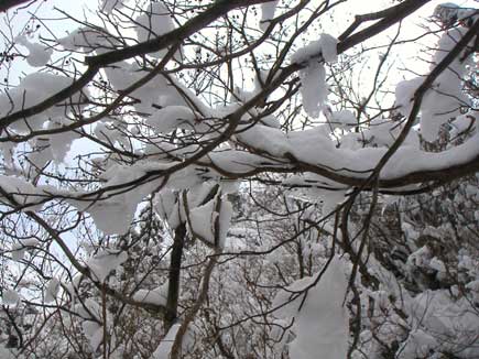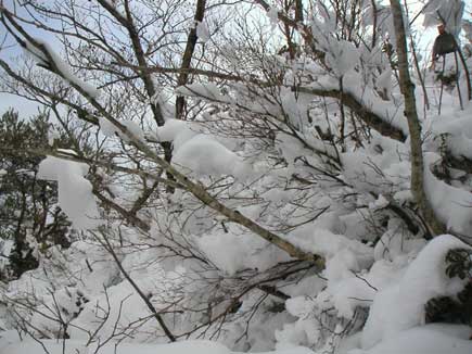 雪に埋もれて道があるような、ないような状態です。上空は風が舞い、雪の重みで木がしなり、雪を被り、踏み分け、掻き分けと大格闘しました。全身雪まみれで雪だるま状態です。最高にうれしい雪との出会い、これがあるから雪山は止められないのです。