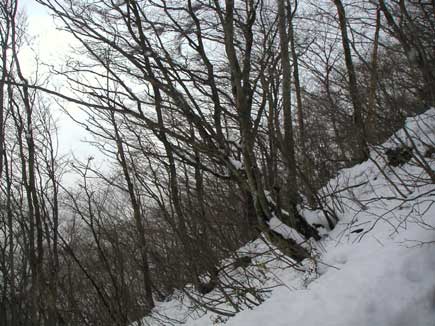 下りは樹林の中、しゃくなげが雪に埋もれています。春まで耐えてブーケのような華やかな花を見せてくれるのですね。