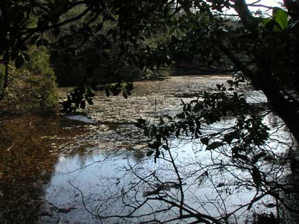 この山系ではもっとも大きい池ノタノホリです。落葉をためた水面は静かで滑らかで動きません。
