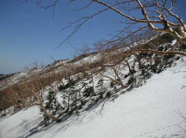 ようやく直登から斜面のトラバース気味になり稜線が近いことを感じる。でももう上りはいらないと足がわめいている。