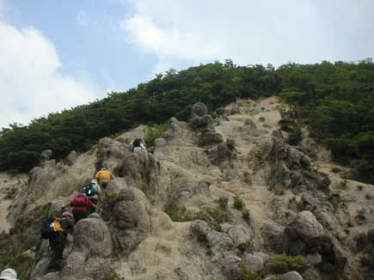 宮妻ヒュッテ駐車場から林道をしばらく進み右にカズラ谷コースをとります。水辺を飛び石伝いに行き、小さな滝を見て樹林の中の上りになります。風が通らず非常に暑い上りが続きますがそれでもどこかに風の道があるようで、下から吹き上がる冷たい風に出会うと、口々に「わァー 生き返る〜!」