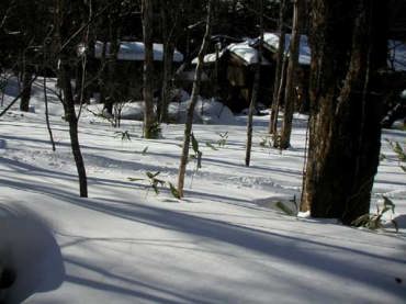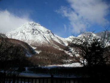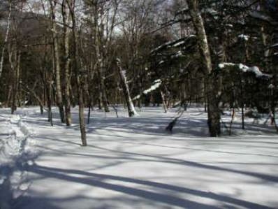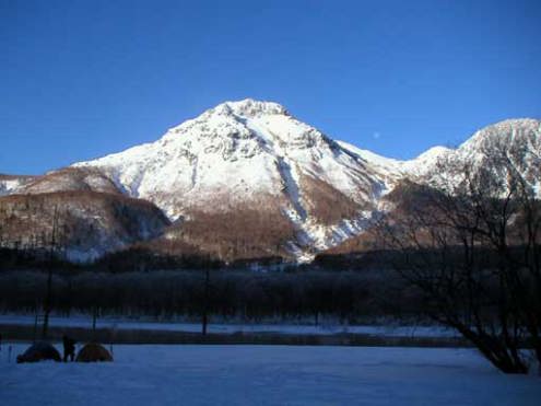 大正池から林間コースを取る。新雪にスノーシュー、そりのトレースが気ままに曲線を描き、雪面には樹々が長い影を光の中にくっきり落とす。木立を通して行く手には明神岳が青い冬空に映える。