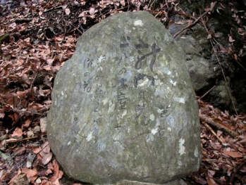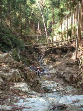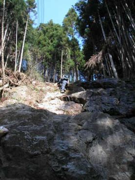さて、いきなり倒木とガレ場に直面します。もちろん今日はヤブ覚悟でリーダーの計画書には不思議な忠告「安物の服でどうぞ」とあります。気合を入れて急斜面や岩をよじ登ったり、巻いたりしばらく格闘します。絶えずLからは三点支持を確実にするよう、落石しないようにと注意があります。11名無事に急斜面をトラバースしてのぼったところは実に広いきれいな道がずっと下から続いている…のでした。