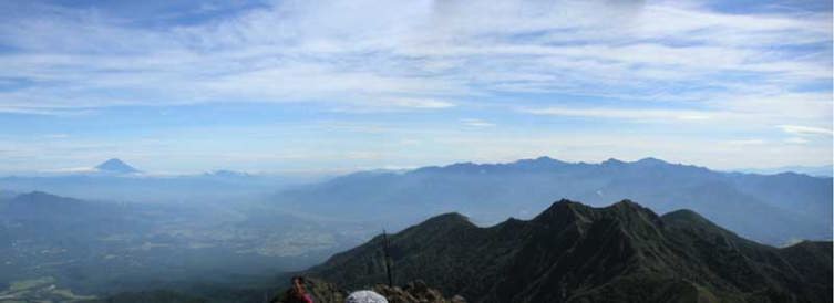 山頂に立つと北から南へ八ヶ岳の全貌が一望です。その先には南アの大きな山が控えています。あまりの心地良さに昨夜の寝不足もあって山頂でゆっくりくつろいでしまいました。