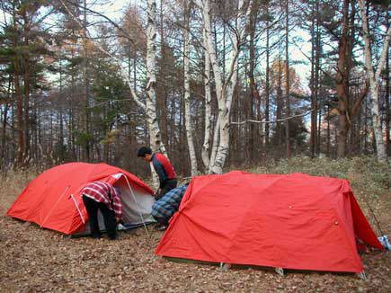 落葉のじゅうたんにテントを張ります。カサカサと音のする落葉のじゅうたんは快適なマットになり、干草ではないけれどハイジの世界のようです。(この落葉のマットはとても寝心地が良かったです)