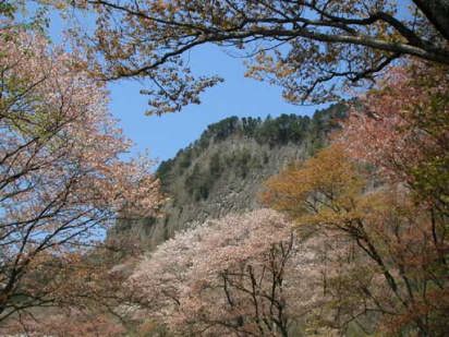 桜の花を通してそそり立つ屏風岩の柱状摂理がはっきり見てとれます。