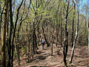 次々に植生が変わりブナやリョウブ、ツツジ、ヒメシャラなどの自然林になり、眩いばかりの緑です。