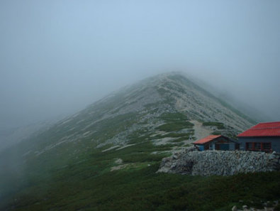 山荘から見えていた避難小屋から左に回りこむと山頂の祠がガスの中から現れます。と見る見る青空が見えてきてなんと言う幸運でしょう!