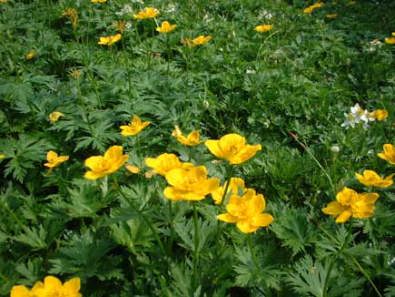 沢筋を登りきると次はシナノキンバイのお花畑、もうここまで来ればあとの時間も読めるのでゆっくり休憩します。上空は少しガスですが、一面にシナノキンバイの鮮やかな黄色とハクサンイチゲの純白の饗宴です。
