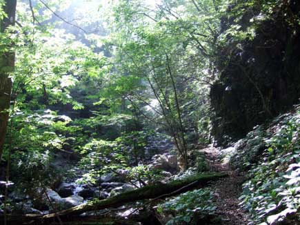 登山口の階段をのぼると沢沿いの道になり、いきなりグリーンシャワーが降って来た。