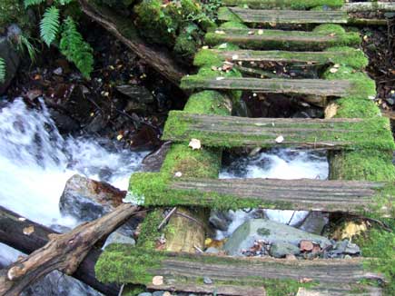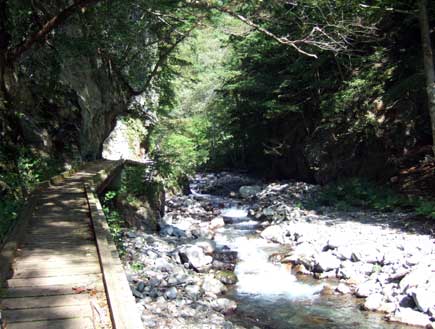 いくつも桟橋を渡ります。殆ど苔むして朽ちかけて、一人づつ渡るように立て札があります。ピカピカの白木でない、赤い鉄の桟橋でないところが、この渓流にはピッタリなのです。古を偲び、先人も多数歩いたであろう長い歴史をそこここに感じています。