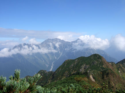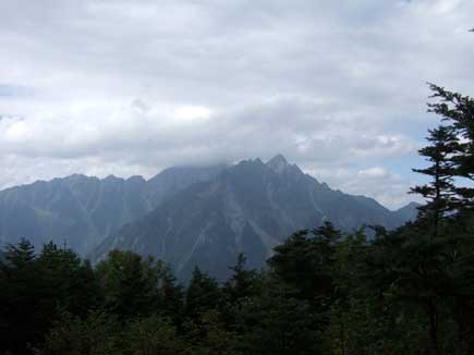 あえいで上りきったK1は素晴らしい大展望です。穂高連峰がグッと近く、眼下には上高地一望です。白い梓川と帝国ホテルの赤い屋根が童話のような優しさを添えています。目を上げれば端整な姿の笠ヶ岳、西穂山荘から丸山、独標、西穂、ジャンダルム、ロバの耳、奥穂、前穂、吊尾根……3000mの壁です。
