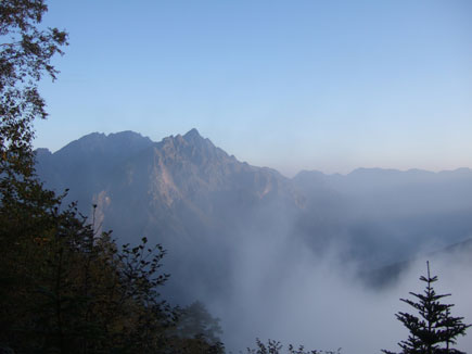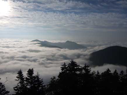 樹林に入りますがスタジオジャンクションや樹間から穂高の朝を見ます。まだ雲海は眠って、漂っています。茜色には染まっていませんが青白い雲海は大海原のようで島のように山が浮かんでいます。
