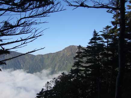 ジャンクションピーク(2428m)の地点を過ぎここからがアップダウンの多いところ、これは帰路もいやな予感です。根っ子がからみ、ぬかるんで滑ります。かなり下って湿地帯を過ぎ、いくつかの大きなガレ場もあり島々谷が見えています。