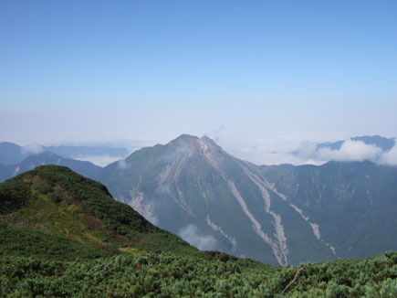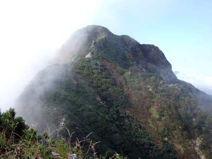 K1が頭上に大きくかぶさってきました。急峻なルンゼ状、浮石、落石とキツイのぼりでした。でもほんのりとブナやダケカンバが黄色味を帯び高い空に浮かぶ雲ももう秋の風情です。