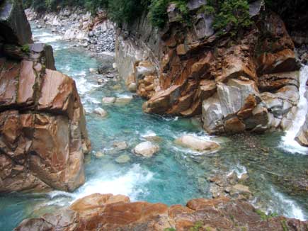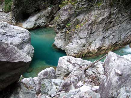 十字峡は豪快にとてつもなく大きな十字を描いています。棒小屋沢と剱沢とがここで交差して本流に流れ込んでいます。5月の連休に爺ヶ岳から見た棒小屋沢はただ真っ白の雪の帯でしたが、あの雪が谷を駆け下りここまで来たのですね。吊橋とは反対方向に少し下った所に大岩がありそこから見る十字峡は音も水流も生々しく大迫力です。