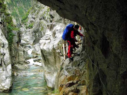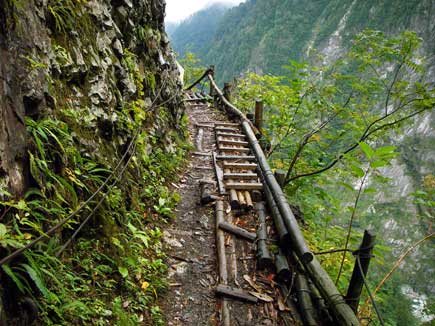 岩壁に2本の丸太をワイヤーで束ねただけの橋が随所にあります。下は奈落の谷底、山側の岩には命綱とも言えるワイヤーが取り付けられていますが、私には遠くて手が届かない所が何度もあり、手離しで渡ります。これってサーカスみたい!