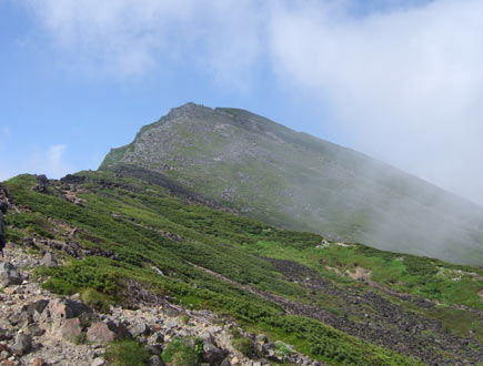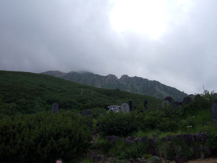 花を楽しんでいるうちに賽の河原を過ぎて五の池小屋です。摩利支天の端整な姿が大きくのしかかるようです。