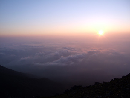 ご来光はおふとんからよりもやはり山腹から見たいもの、と早々に起き出して月明かりを頼りに少し上がったところで待ちます。ほんのり赤みがさして厚い雲海が少しづつピンクに染まって、小さなお花のつぼみのように太陽が顔を出し、見る見る大きくなるのです。山々の朝一番の呼吸を感じる時です。