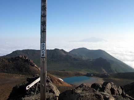 山頂から見る二の池は白い雪渓を残しコバルトブルーの魅惑の色をたたえ鏡のような水面を見せ、乗鞍岳は雲海にぽっかり浮かんで、遠景に大きな八ヶ岳がぼんやり霞んでいます。目を転じれば打って変わって地獄谷の噴煙と赤茶けた岩肌、奇岩、硫黄の匂い、この両極端の展望に目を奪われてしまいます。