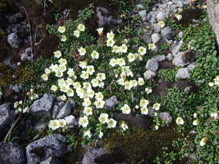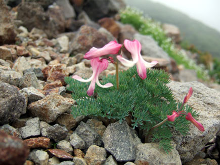 奇岩の林立する地獄谷を通って岩場を通過します。この地獄の岩場では何とうらはらに可愛い花が次々と咲いてこれは感動ものでした。イワヒゲ、イワウメ、ツガザクラ、コケモモ等10cにも満たない小さなお花ばかり、この過酷な条件では岩を這うようなお花しか生きて行けないのでしょう。