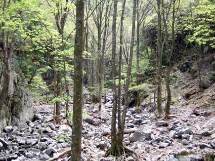 登山口の急な階段を上がれば緑いっぱいの明るい沢です。緑がいっせいに押し寄せて来るゥーー、みたいです。ブナやカエデが多い、透ける緑のレンゲ坂谷です。