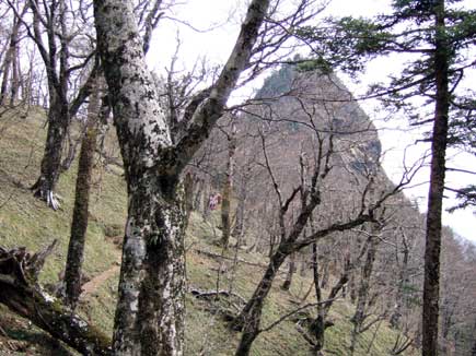 下りは法力峠から母公堂へ下ります。樹間から大日岳、どこから見ても同じ形ですね。