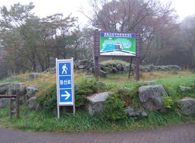 下りに見えるのに上りという不思議な道路で(約100mほど)実際にペットボトルをおくと上りに見える方に転がっていきます。単なる目の錯覚(とは書いていませんが)だそうです。昨日の漢拏山全景が見えます。