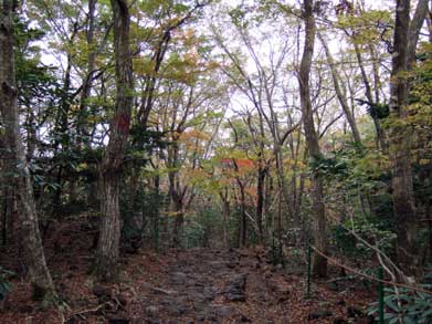 下りは成板岳コースを下ります。こちらも道は整備されてややコース的には観音寺コースより長いですが麓では美しい黄葉の森が続きます。山頂にいた若い学生さんの何人かが走って下りて来ました。すごいパワーです。