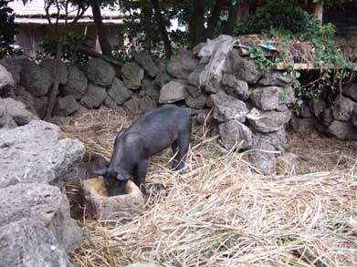 地域一帯がかっての民俗を残す保護区に指定されて今も実際に人が生活しているところです。風が強いため火山岩を積んだ石垣や綱で押さえた藁ぶきの家など伝統的な民家、民具などがまじかに見られ、なかでもショッキングだったのはかって使われていたトイレ。人間の排泄物がそのまま豚の餌になる造りになっています。こうして育てられた黒豚は韓国一美味しいそうです。が以後、黒豚をいただくのに抵抗が…。