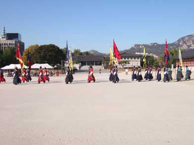 運良く守門将交代儀式が始まるところです。正装の衛兵が太鼓 銅鑼の音と共に1歩も乱れぬ儀式は遠い時代にタイムスリップしました。民族カラーの衣装も儀式も素晴らしくきれいで見事でした。