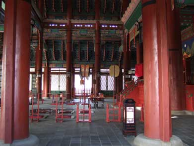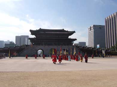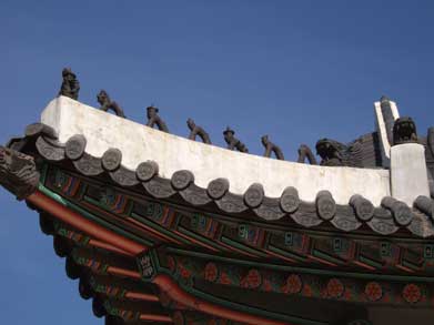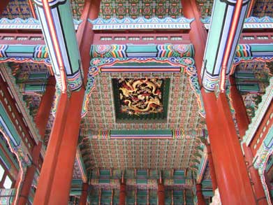 勤政殿 韓国最大の木造建築です。鮮やかな色彩で竜や文様が施され華麗で雄壮、煌びやかな李朝時代が再現されます。