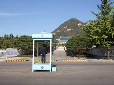 青瓦台 神武門から出ると北岳山を背に青瓦台、大統領官邸です。