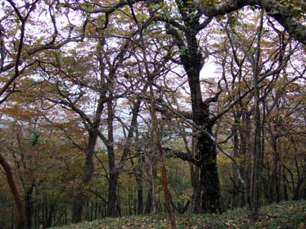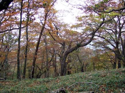 1316のピークを過ぎてテープと小さい標示を見落とさないように北へ下り、(飯高町方面からの道もあるようで、馬駈辻からだと標示板が見難い)黄葉のブナ林を愛でながら木立の中の木梶山に到着です。