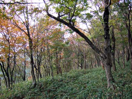 馬駈辻を東にとり高原状の尾根はとても展望の良いところですが、ちょっとガスになり紅葉に染まる桧塚は見えず残念です。でもこの時期、ブナやカエデ、ヒメシャラの中を行くのは快適この上ないです。どの落葉も拾ってみ〜んな持って帰りたい心境です。