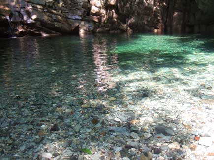 登山口に入るガマ滝は滝そのものは小さいですが、滝壺はたっぷりと大きくその水の青さに感動します。深く澄んだエメラルド色の水は、その後ずっと変わることなくますます青く深く、八剣谷の最後の、最後の、一滴までエメラルドでした。
